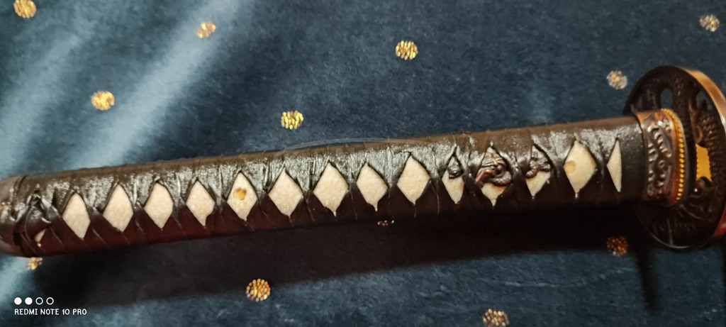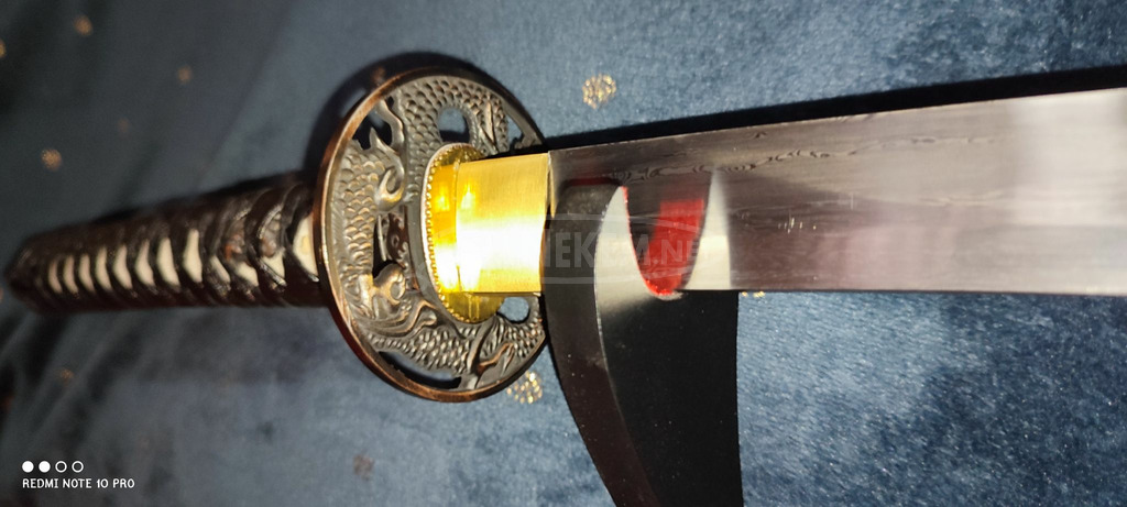 Eladó akciós áron és azonnal vihető a képeken látható-rendelésből visszamaradt, gyönyörűen és részletgazdagon kidolgozott kiváló minőségű Japán (Kawashima Steel Ltd.) által gyártott;- tradicionális kialakítású, élezett(nem játék!!!)vágó-gyakorló, Damaszk(425réteg, 12xhajtogatva) (Damaszkuszi) acél Doragonkuro (Sárkány karom) Katana. A kard pengéje vercsatornaval ellátott, a markolat zsinórozása puha-fekete bőr(könnyen tisztítható!), alatta valódi Rájabőr a tsuba(kézvédő) bronz, Sárkány motívummal! A markolatot a pengére 2db banbusz mekugi(rögzítő tüske) rögzíti, ezek eltávolításával a kard teljesen szétszedhető és bármely alkotórésze cserélhető, illetve a penge is esetleg módosítható! A saya(kardhüvely) feketére festett és fényesre lakkozott Magnólia fa, a habaki rézből készült! A kard teljes mértékben kézzel készített illetve kovácsolt... A Katana teljes hossza 106cm. Ajándék fekete selyem kardzsákot adok hozzá! Szállítás futárszolgálattal megoldott a vevő terhère! Egyéb információk és adatok a képeken láthatók, illetve egyéb részletekkel kapcsolatban telefonon(+36303018714) vagy üzenetben (bushido.soul.swords@gmail.com) lehet érdeklődni! Kérem, keressen bizalommal! Köszönöm szépen hogy megtisztelt azzal hogy megtekintette a hirdetésem!